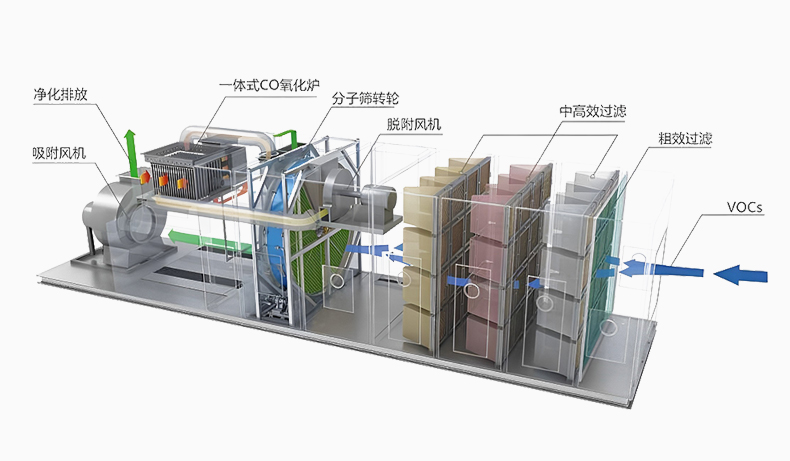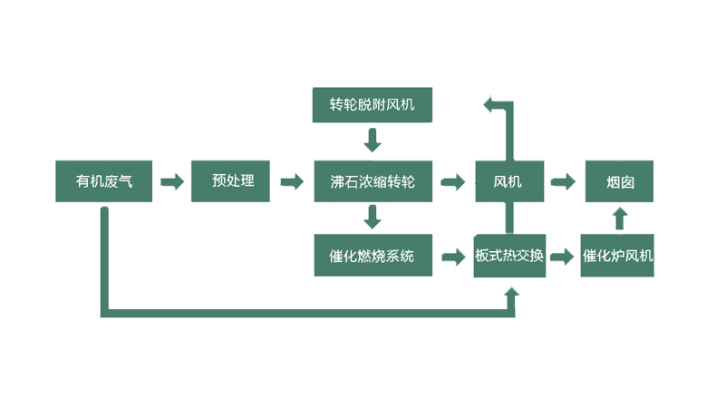沸石轉輪+催化燃燒設備是針對目前vocs氣體種類繁多、性質各異、采用一種凈化技術往往難以達到排放要求而設計的新一代治理設備,該系統主要是將預處理單元、吸附濃縮單元有機地結合起來,是目前防治vocs氣體較為完善并且去除效率較高的一種有機廢氣處理設備。